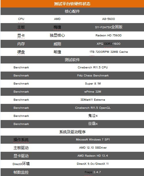 本次測(cè)試,我們選擇了主流級(jí)的AMD A8-5600處理器來(lái)搭建平臺(tái)。該處理器擁有4核心,主頻高達(dá)3.6GHz,動(dòng)態(tài)頻率更是可達(dá)3.9GHz。處理器內(nèi)置了Radeon HD 7560D獨(dú)顯核心,雖然比A10-5800K的內(nèi)置顯示核心的性能稍差,但也完全能夠滿(mǎn)足一般用戶(hù)的使用需求。內(nèi)存方面,我們選擇了威剛XPG 1600MHz 4GB*2,主流的內(nèi)存容量及頻率也能充分發(fā)揮APU平臺(tái)的性能。