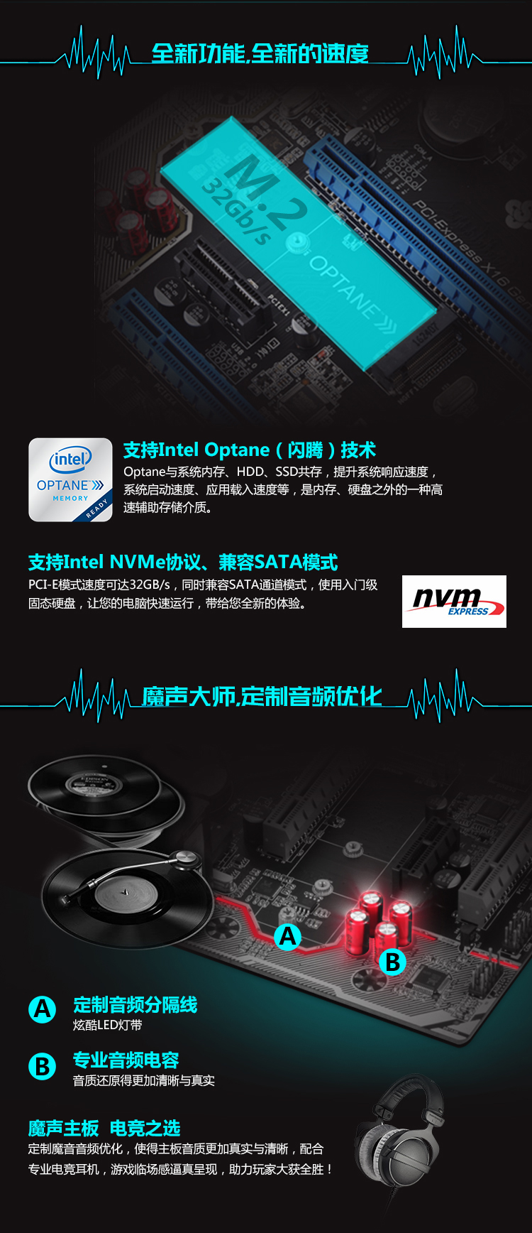 VGA+DVI+HDMI接口,雙顯卡插槽,支持Optane/Nvme/SATA的M.2插槽,數(shù)模分割線,音頻電容,中空散熱片