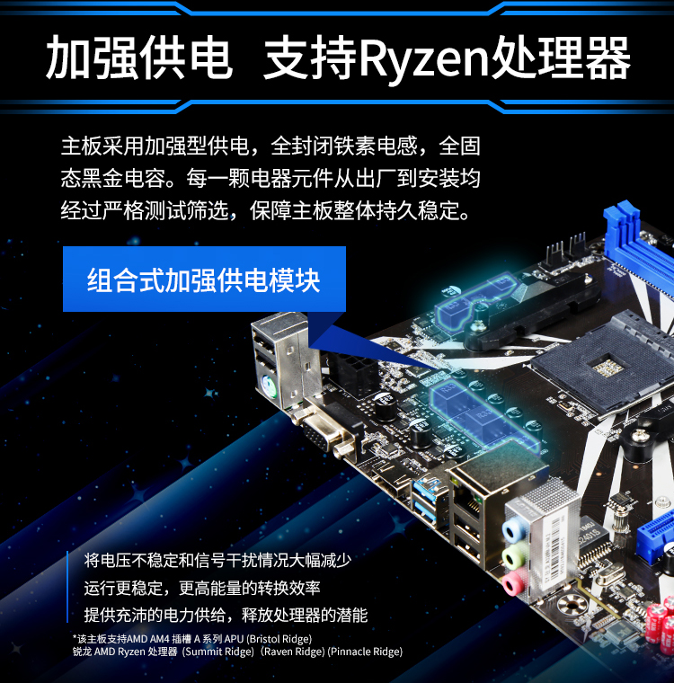 - 支持 AMD AM4 插槽 A 系列 APU (Bristol Ridge) 與銳龍 AMD Ryzen 處理器 (Summit Ridge) (Raven Ridge)