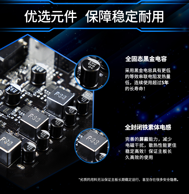 - 1x M.2高速接口,1顯卡插槽,2條DDR4內(nèi)存槽,五重音頻優(yōu)化,五相供電,整版ESD防護,中空散熱片