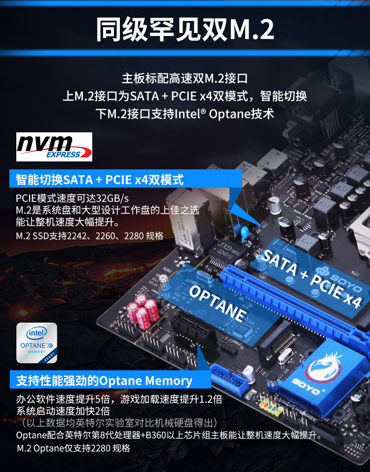 主板標配高速雙M.2接口,智能切換SATA+PCle*4模式,速度可到32GB/S。還可支持英特爾Optane加速技術,讓你的機械硬盤更上一層樓。M.2是系統(tǒng)盤和大型工作盤的上佳之選,讓整機的速度大幅提升。