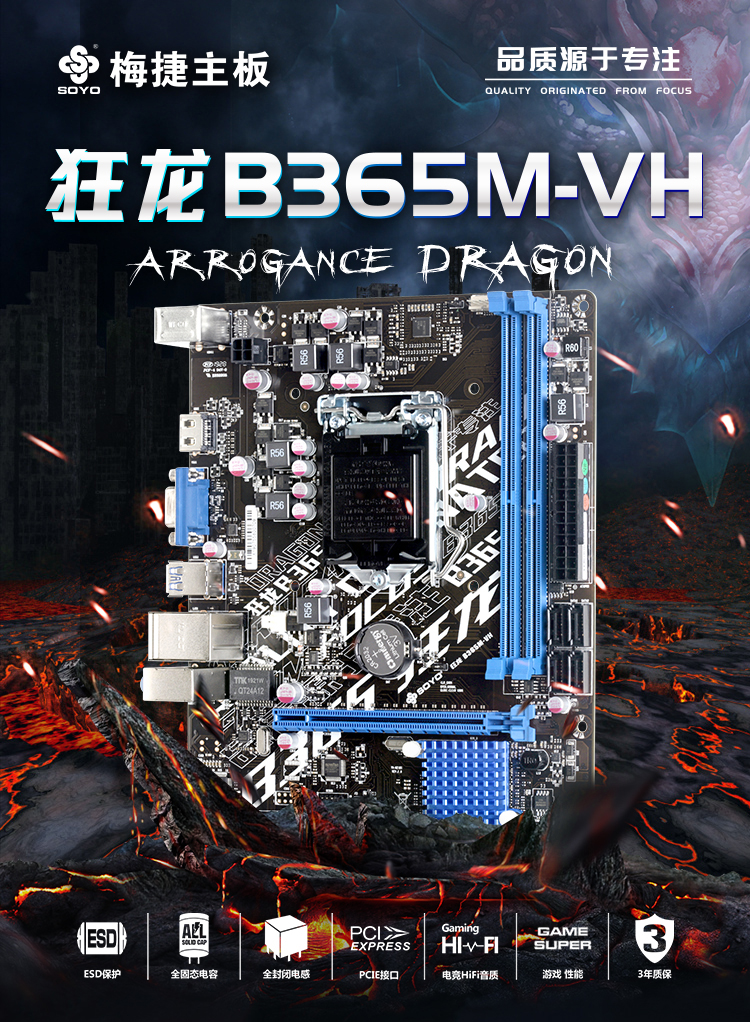 作為主板界老牌廠商,梅捷對于大部分玩家可謂不陌生,梅捷這次推出的狂龍B365M-VH主板,外觀上加入了比較潮流的絲印元素,多個碩大的文字絲印組合,仿佛紋有一身圖騰的部落酋長。