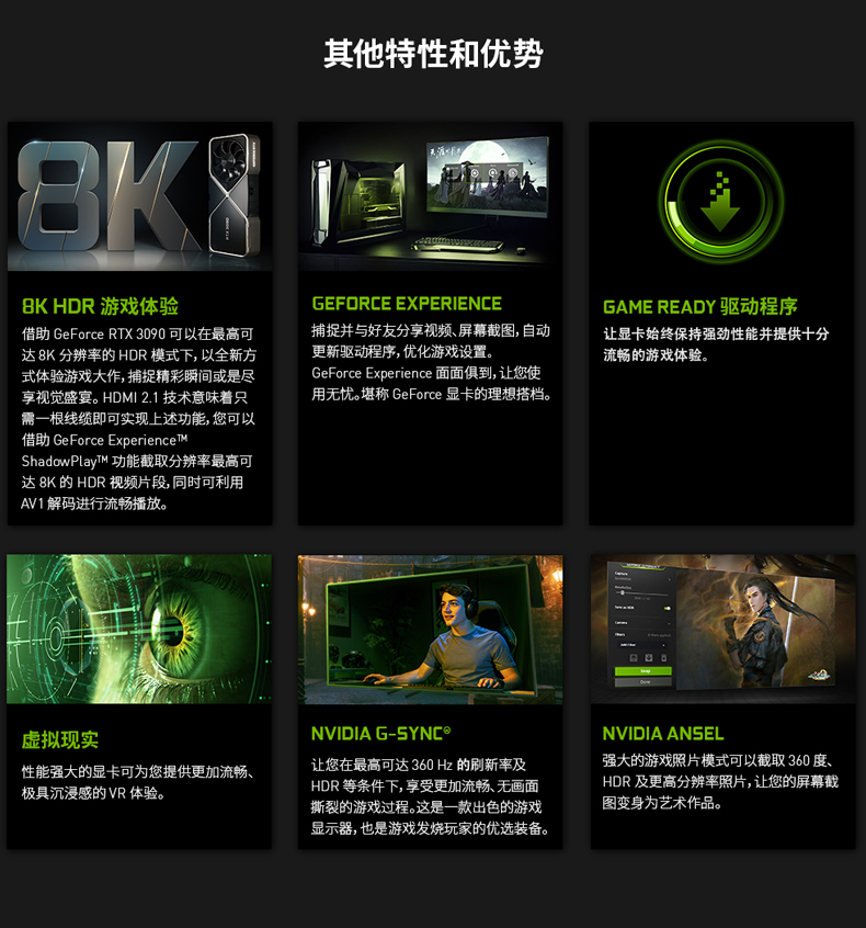 支持Simultaneous Multi-ProjectionVR圖像矯正技術(shù),VRWorks Audio虛擬現(xiàn)實音頻技術(shù),Ansel截圖功能,PhysX物理加速技術(shù),NVIDIA CUDA,NVIDIA REFLEX,PureVideo HD高清硬件解碼,動態(tài)超級分辨率,MFAA,GeForce 3D Vision,GameWorks™,G-Sync™-Ready,GameStream™-Ready,GeForce ShadowPlay™,GPU Boost™